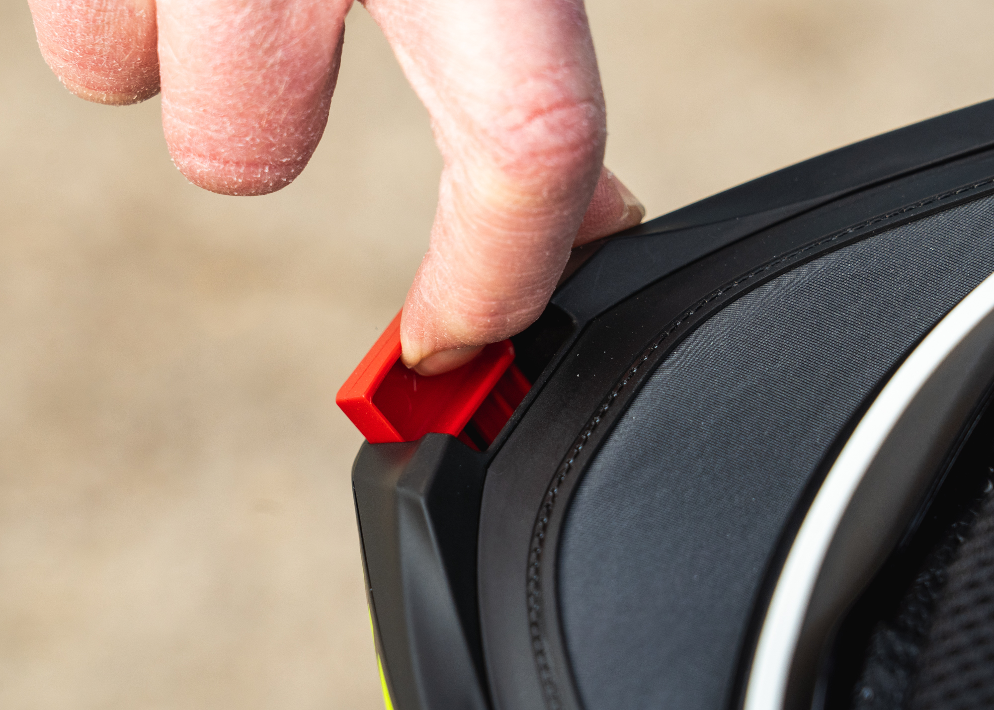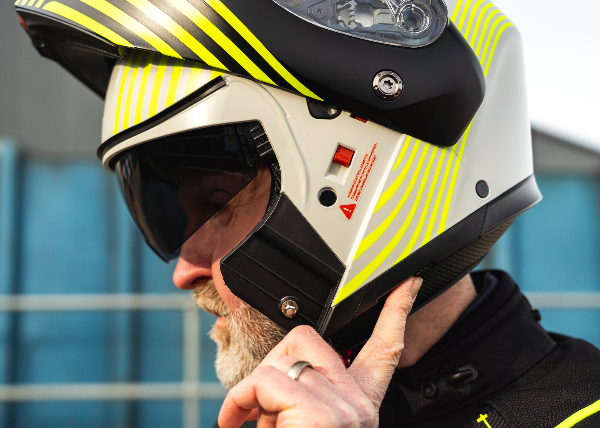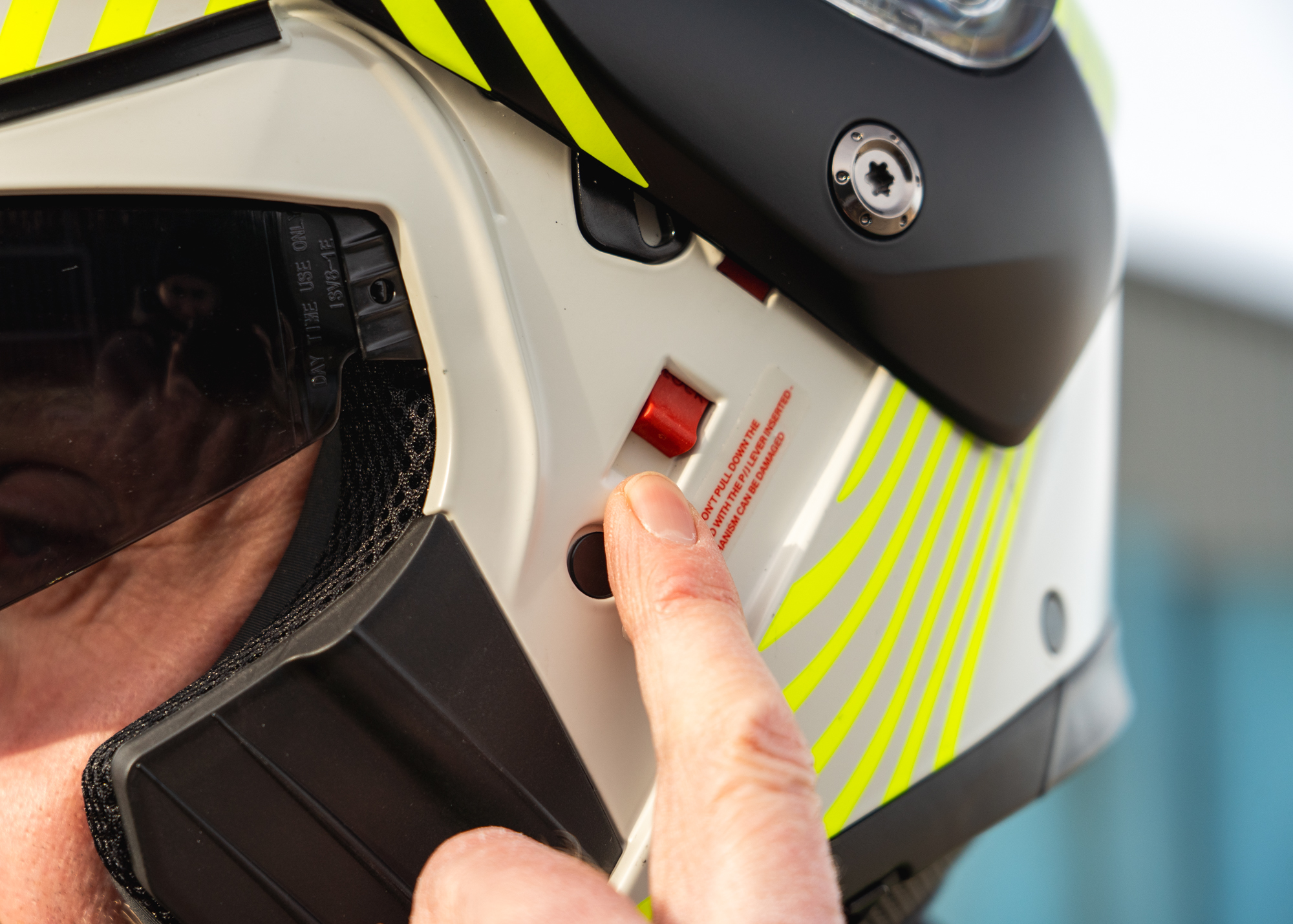 Once lifted, the chinbar has two open positions. It takes a firm push to reach the first, where it feels securely held. Push again and you reach a second open position, which can be locked in place using a separate switch on the side.