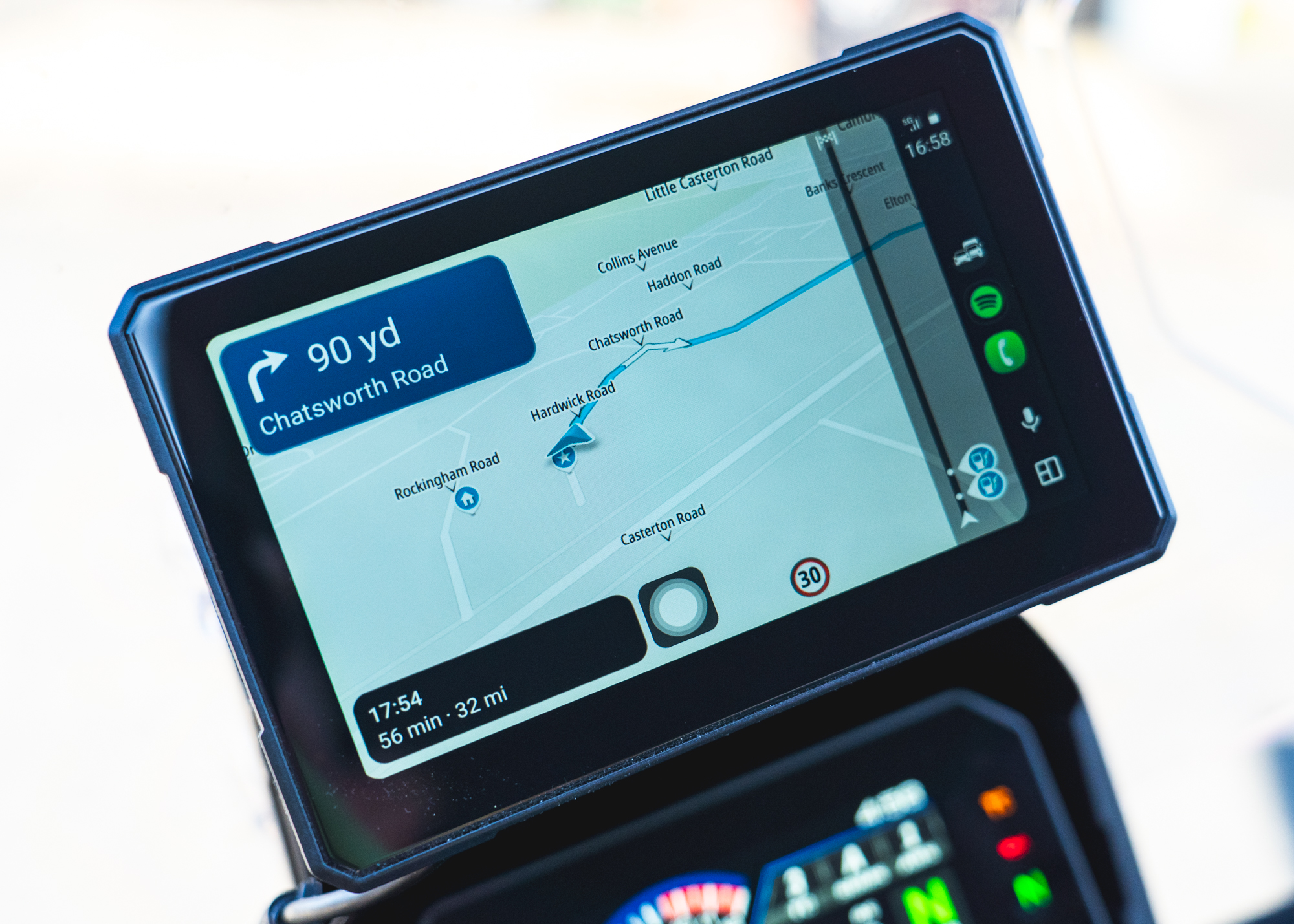 It uses a 7in screen mounted to the bike, mirroring compatible apps from your phone and acting as a control hub for navigation, music and calls.