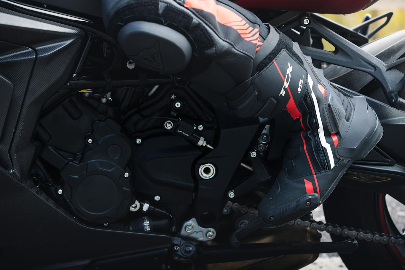 TCX RT-Race Boots - Black / Dark Grey They are an amazing boot and fit really well they make you feel fully protected and are so comfortable. Only thing I will say is they are a bit stiff to get on and off but could also be because they are new but they also feel very snug until you have them on a few minutes then they feel perfect, I am a uk size 10 and I bought the size 45 and I would say if you want them to feel looser out of the box size up but you don’t really need too as I wore mine in the house for half an hour and they felt spot on.
