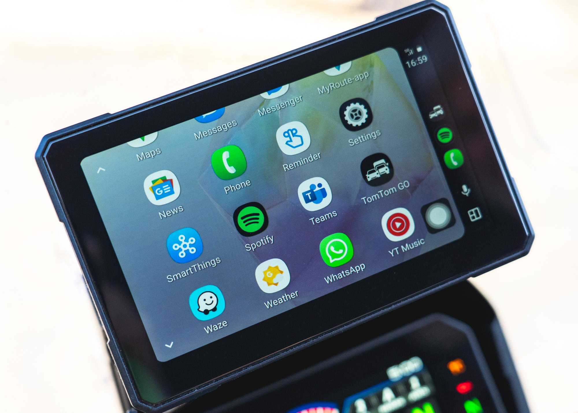 Tapping the centre of the screen brings up a full-screen speedometer with trip and pressure information, while the 'Phonelink' icon launches CarPlay or Android Auto. From here, compatible apps on your phone become available through the app matrix.